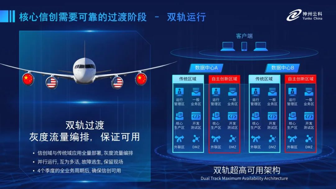 為幫助客戶更好地應(yīng)對數(shù)字經(jīng)濟(jì)時代對應(yīng)用可持續(xù)性的高要求,實(shí)現(xiàn)信創(chuàng)與數(shù)字化兼得,leyu.樂魚推出了雙軌超高可用架構(gòu)。雙軌超高可用架構(gòu)在雙活數(shù)據(jù)中心的分區(qū)調(diào)度基礎(chǔ)上,增加信創(chuàng)域和非信創(chuàng)域的分域調(diào)度,實(shí)行信創(chuàng)域與傳統(tǒng)域應(yīng)用全量部署,使雙中心運(yùn)營變?yōu)殡p中心四區(qū)域并行運(yùn)行,互為多活,將傳統(tǒng)架構(gòu)變?yōu)榉謪^(qū)分域協(xié)同的多活雙軌超高可用架構(gòu)。幫助客戶在新架構(gòu)下,保障“信創(chuàng)”的同時解決性能瓶頸,提升穩(wěn)定性,保證應(yīng)用可持續(xù)性,最終實(shí)現(xiàn)信創(chuàng)區(qū)域和非信創(chuàng)區(qū)域的平滑過渡,完成國產(chǎn)化替代目標(biāo)?!?/p>