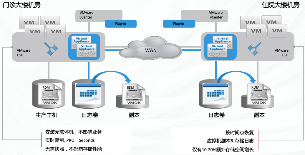 院區(qū)內(nèi)兩個機房需要協(xié)同保障業(yè)務(wù)連續(xù)性,同時要能防范因人為誤操作導(dǎo)致 重大損失的災(zāi)難,并能決速恢復(fù)系統(tǒng)。